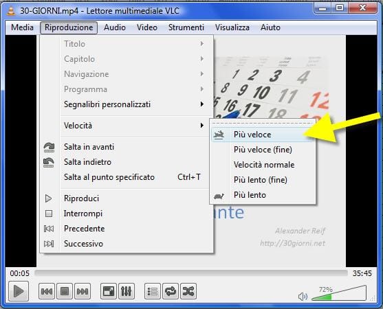 - utilizzare il menù di VLC: Riproduzione -> Velocità -> e poi scegliere “Più veloce” oppure “Più lento“. Personalmente trovo molto scomoda questa soluzione